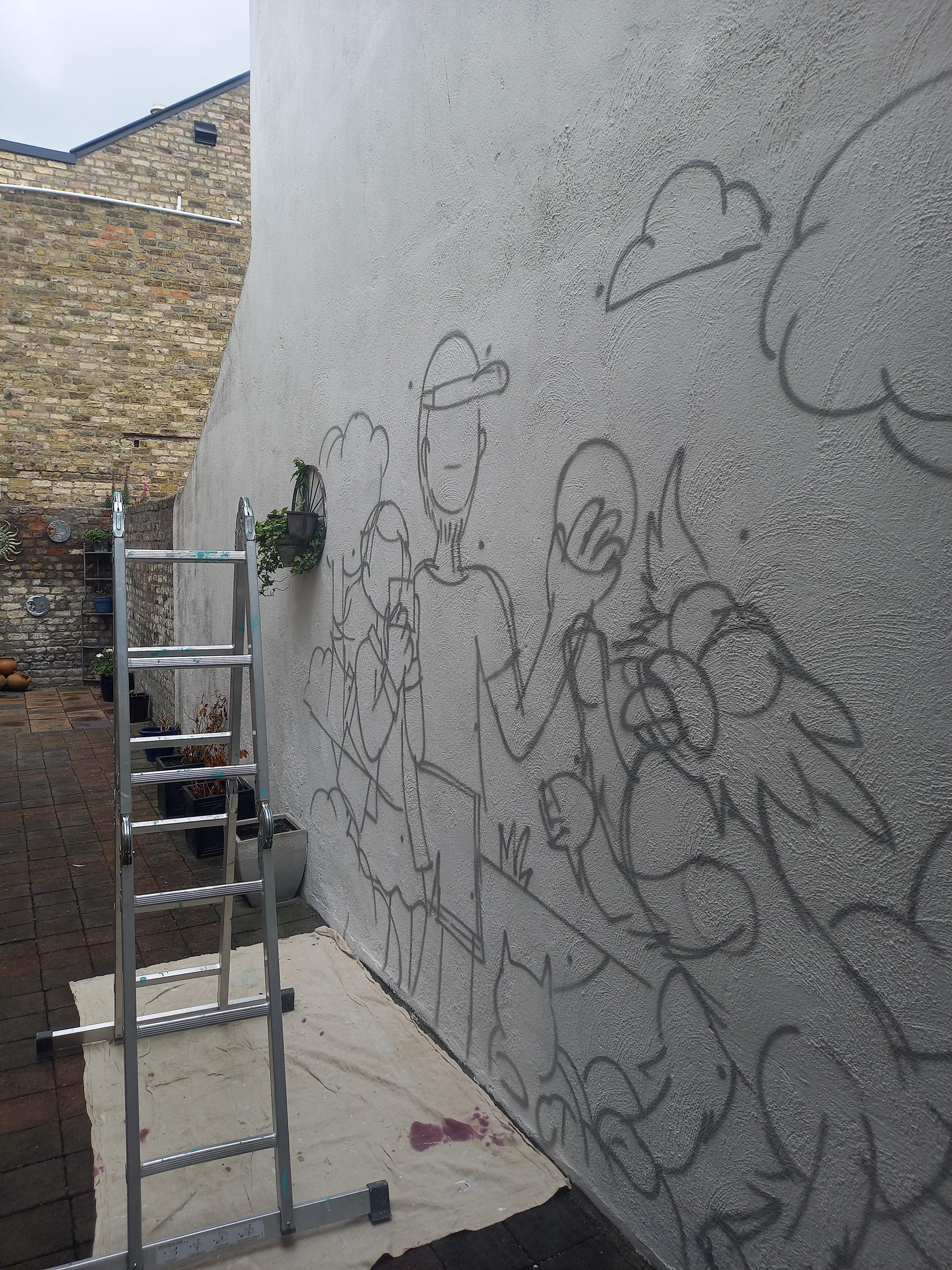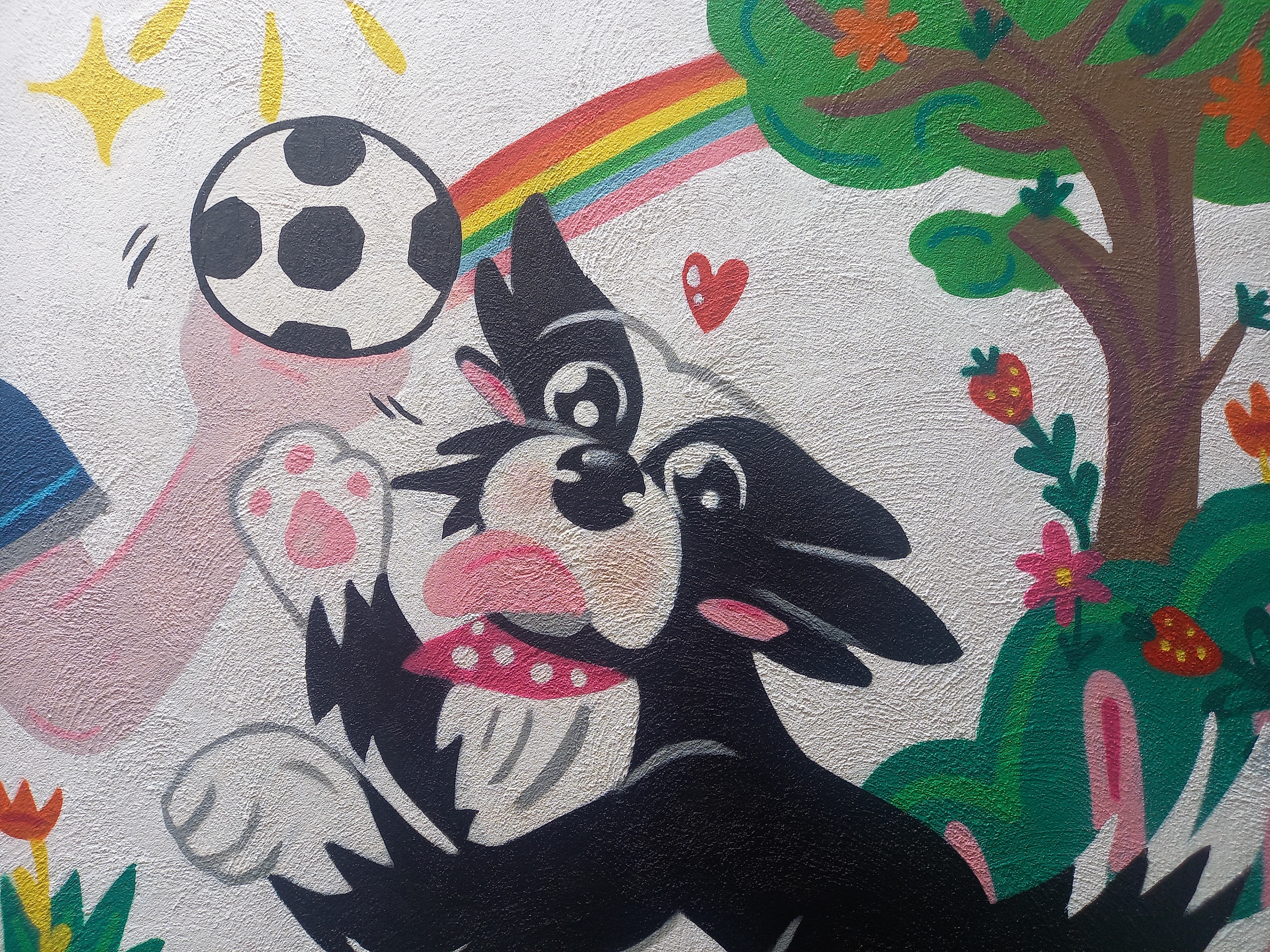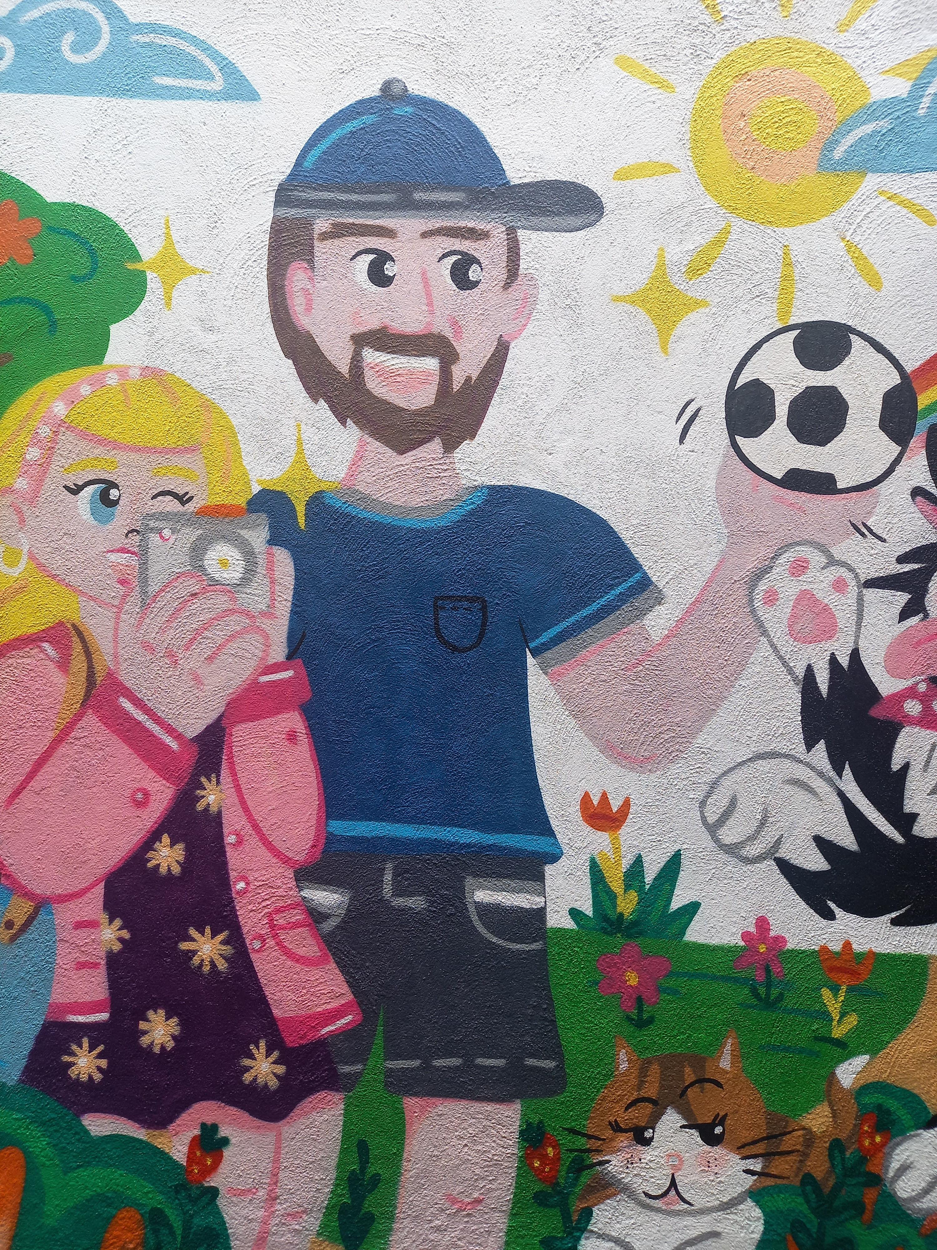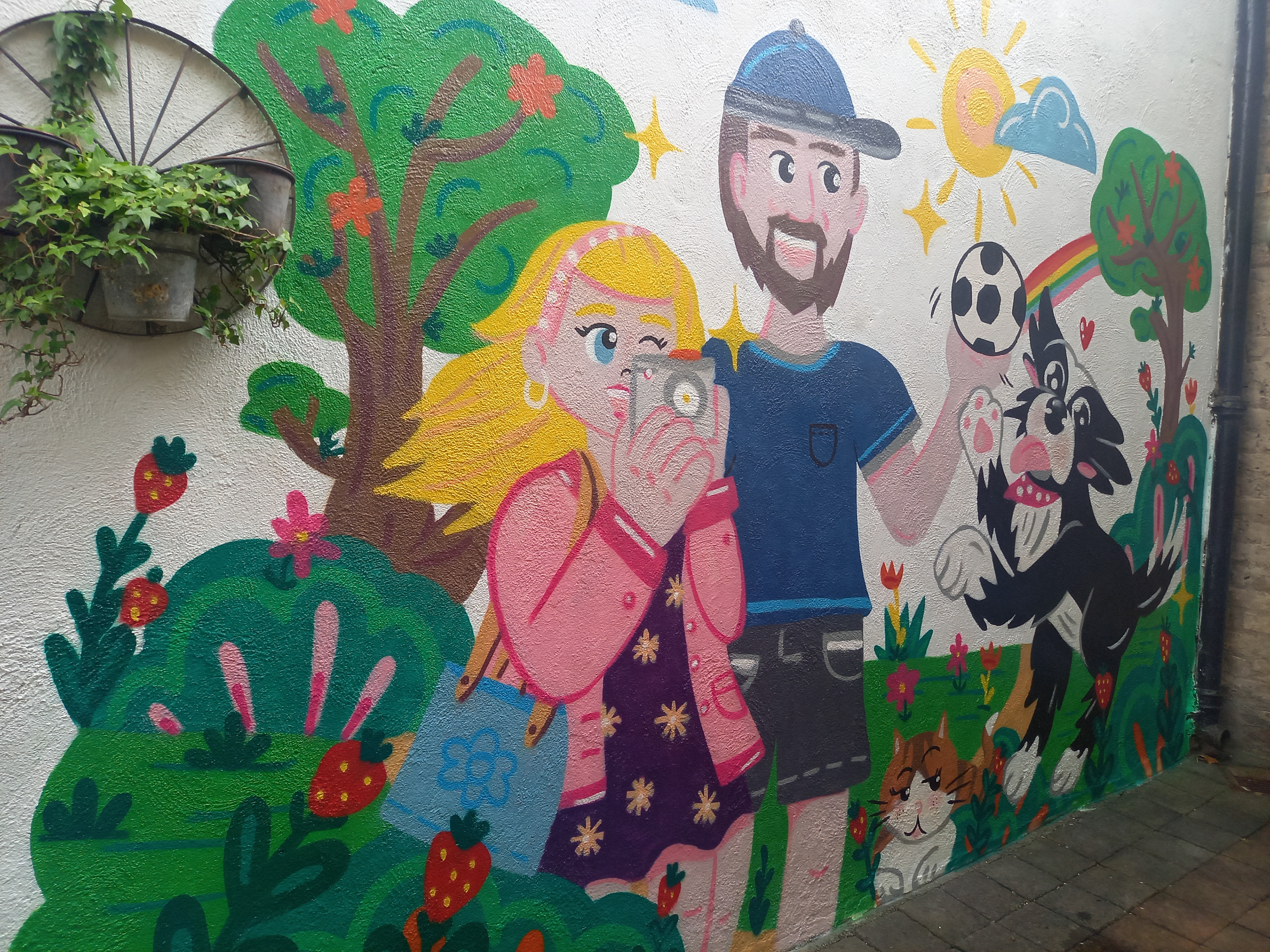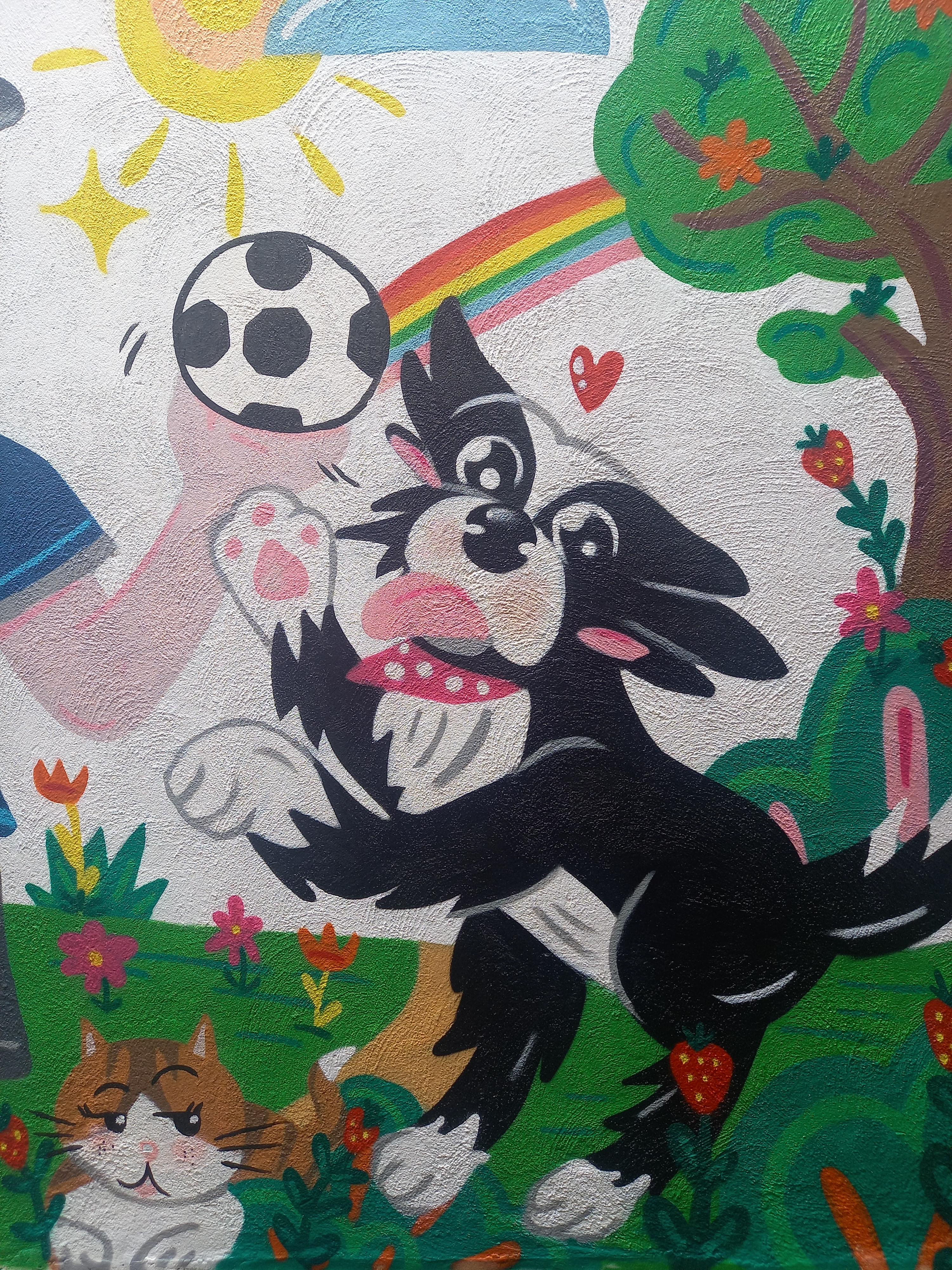 Painted in a home backyard, inspired by family members and their fun pets, Zowie the border collie loves to play with the ball and is really active. Lauren, instead, prefers to chill.